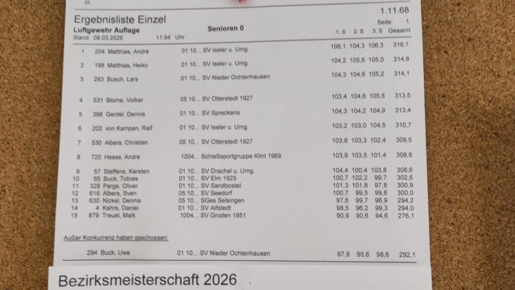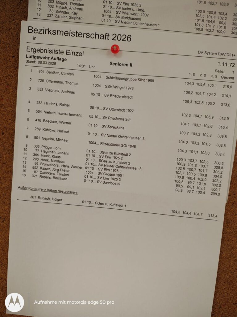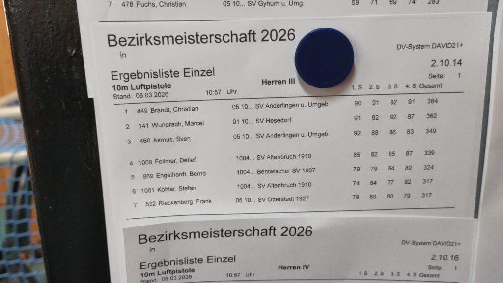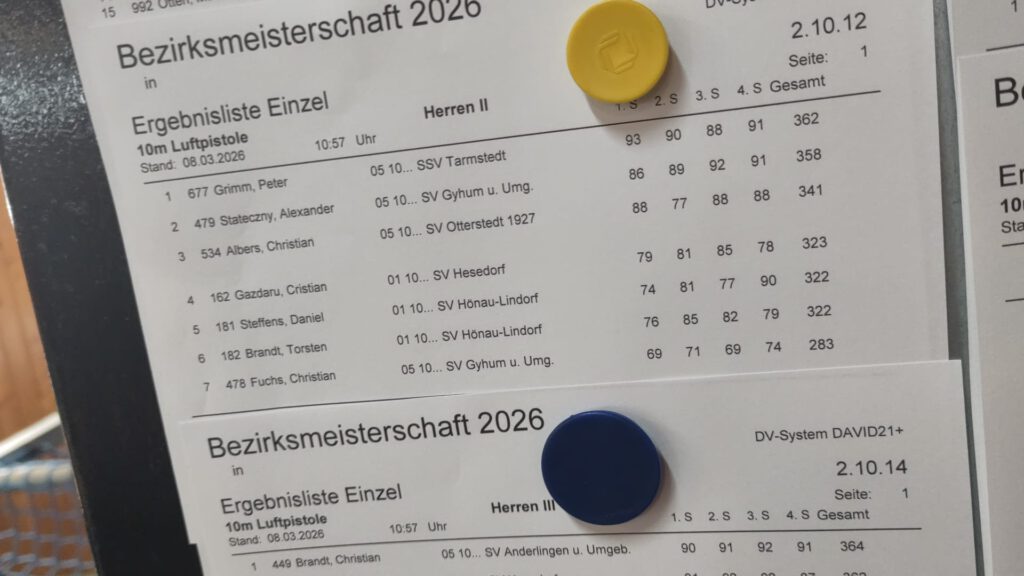 An diesem Wochenende wurde die Bezirksmeisterschaft Luftdruck (LuPi und LG Freihand und Auflage) in Nieder Ochtenhausen ausgerichtet, dazu die BM Blasrohr in Drochtersen. Unseren Verein haben dabei vertreten: Frank, Volker, Rainer, Nadine und Christian, wobei Nadine für Rhadereistedt antritt (wir sind natürlich trotzdem stolz auf sie! 😉). Frank hat am Samstag in der Disziplin LuPi 10m 317 Ring erreicht: