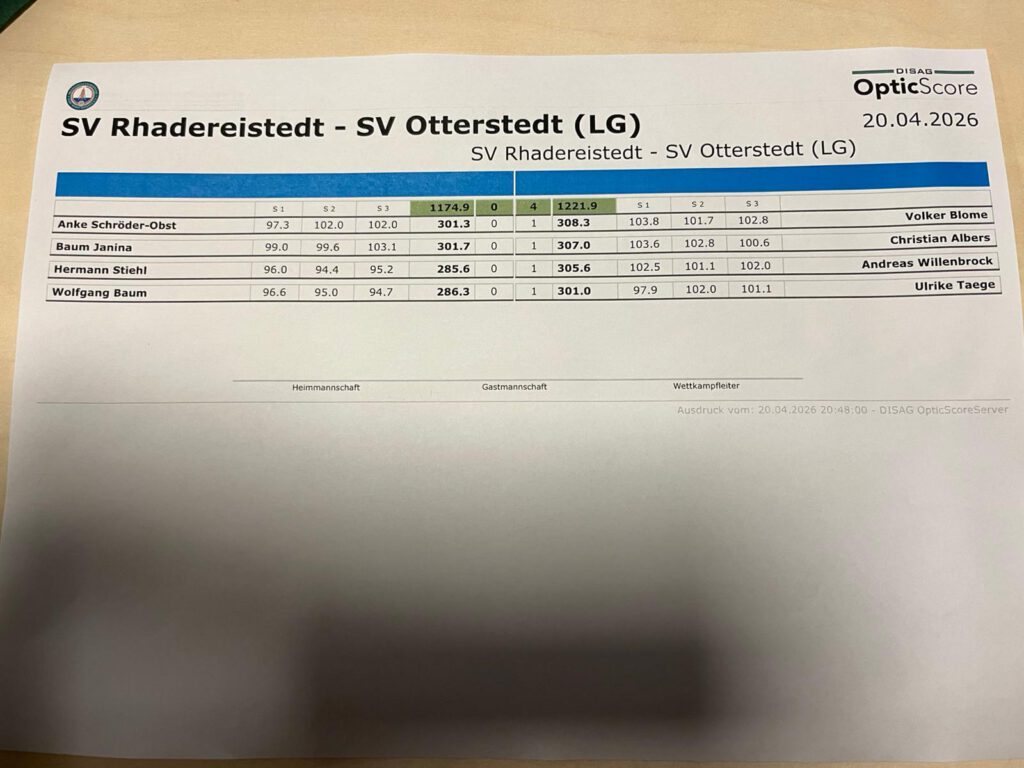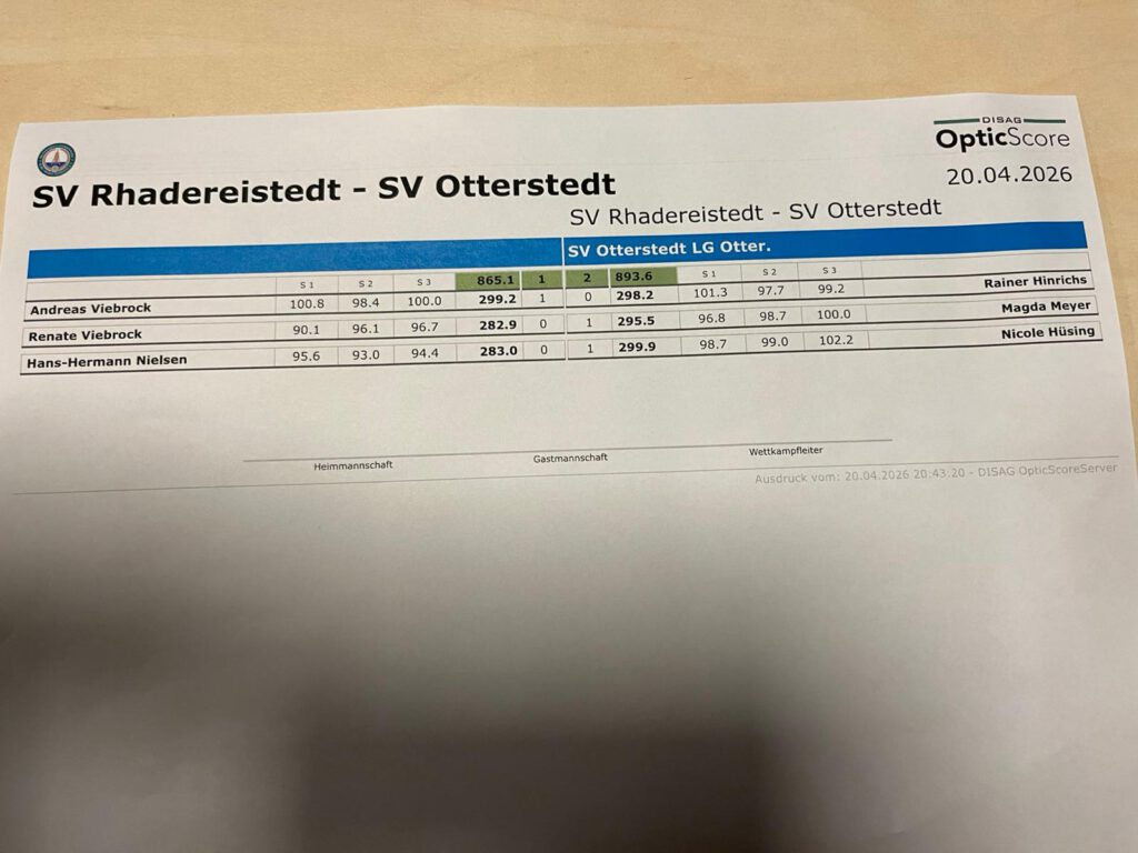 Heute sind unsere Bezirksmatadore Nicole, Rainer und Volker in Nieder Ochtenhausen zur vierten Runde des Bezirkspokals angetreten. Leider war diesmal für uns Schluss. Wir mussten uns der Mannschaft Nieder Ochtenhausen 1 mit 3,6 Ring Unterschied geschlagen geben. Dabei hätte das Ergebnis aus der dritten Runde ausgereicht, um den Gegner heute zu schlagen; das nur um zu verdeutlichen, dass wir nicht aus Zufall so weit gekommen sind!