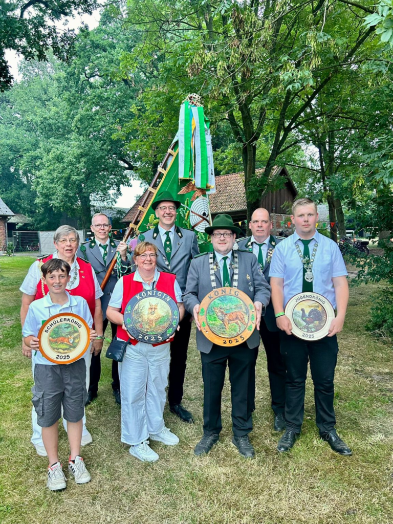 von links: 1. Vors. Ronald Blome, Königin Maja Holsten, Kinderkönig Malte Kruse, darüber Vizekönigin Melanie Schober, Jugendkönigin Leoni Lange, Vizekönig Volker Blome, König Helmut Holsten, Volkskönigin Marita Blum, Volkskönig Marcel Ditzfeld